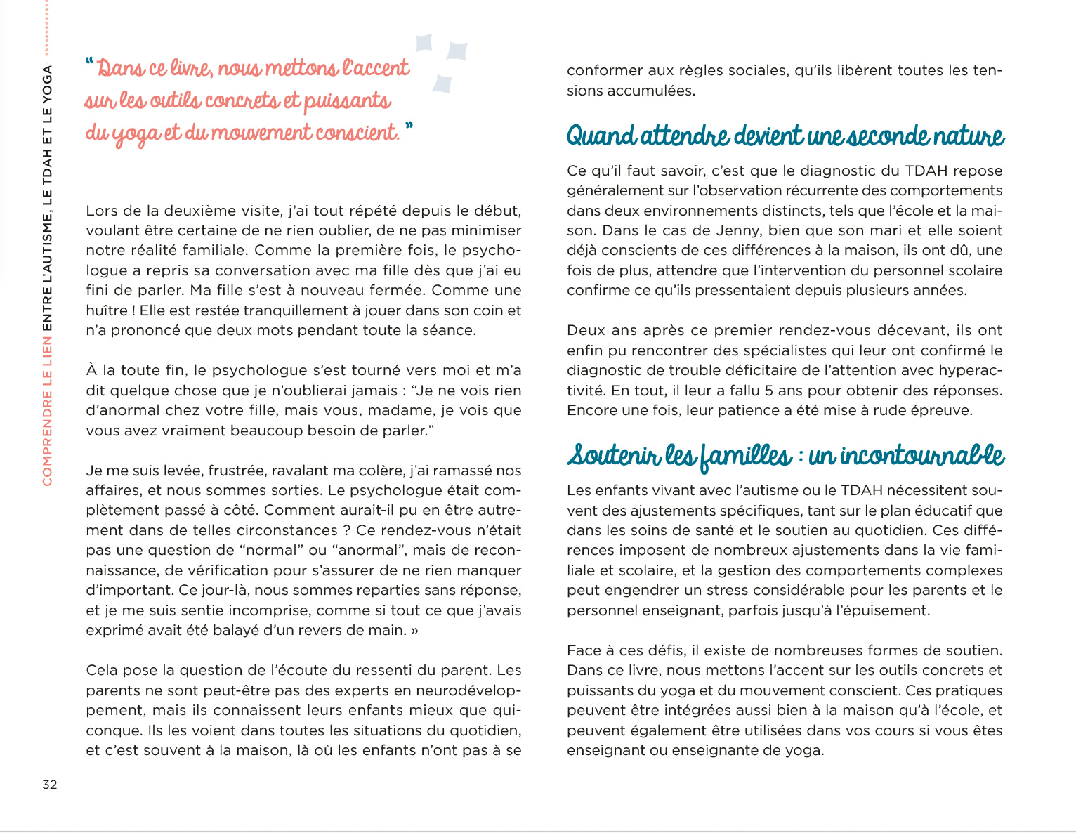 Chaque jour, des milliers de parents reçoivent un diagnostic : TSA ou TDAH. Derrière ces lettres se trouvent des enfants uniques, souvent en détresse, en manque d'ancrage et de sécurité intérieure. Et si la réponse ne se trouvait pas uniquement dans une pilule ? Yoga, autisme et TDAH est un guide doux et puissant pour accompagner ces enfants autrement. Basé sur les 8 sens, il reconnaît qu'un enfant peut être hypersensible à certains stimuli… et hyposensible à d'autres.